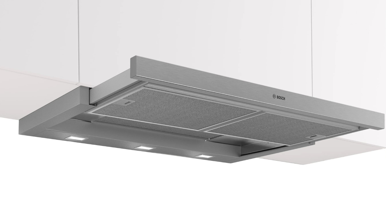 Встраиваемая в подвесной шкаф модель из основной линейки представлена в практичном цвете нержавеющей стали. Особенность этого прибора — возможность синхронизации с некоторыми моделями варочных поверхностей: интенсивность всасывания регулируется автоматически в зависимости от мощности нагрева конфорок. Высокая производительность 680 м3/ч позволяет разместить эту модель в кухне большой площади. Прибор шириной 52 см подойдет для установки над варочной панелью с двумя, тремя или четырьмя конфорками. Для очистки воздуха предусмотрены два режима работы — отвод и рециркуляция. Три скорости рассчитаны на очистку воздуха различной степени загрязненности. Если необходимо удалить частицы сажи, капли жира и другие загрязнения особенно быстро, на помощь придет интенсивный режим. Модель оснащена электромеханической панелью управления с кнопками. Алюминиевый жироулавливающий фильтр многоразового использования легко снимается и пригоден для мытья в посудомоечной машине. Угольный фильтр для удаления неприятных запахов нуждается в замене каждые три-четыре месяца. Для освещения рабочего места предусмотрена яркая светодиодная лампа мощностью 1 Вт.
