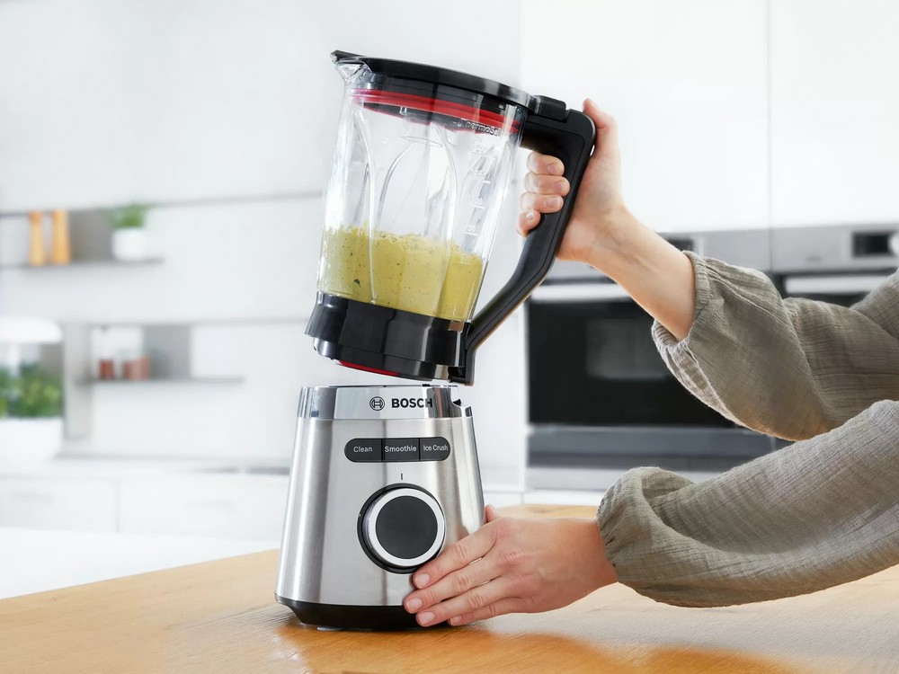 Стационарный блендер Bosch позволяет готовить смузи, коктейли, смешивать соусы и заправки, измельчать продукты до состояния пюре и многое другое. Его конструкция подразумевает автономную работу — вам нужно только положить овощи или фрукты и выбрать режим. Он может как влиться в общую гамму интерьера, так и стать ярким акцентом; доминирующий цвет — серебристый.