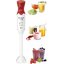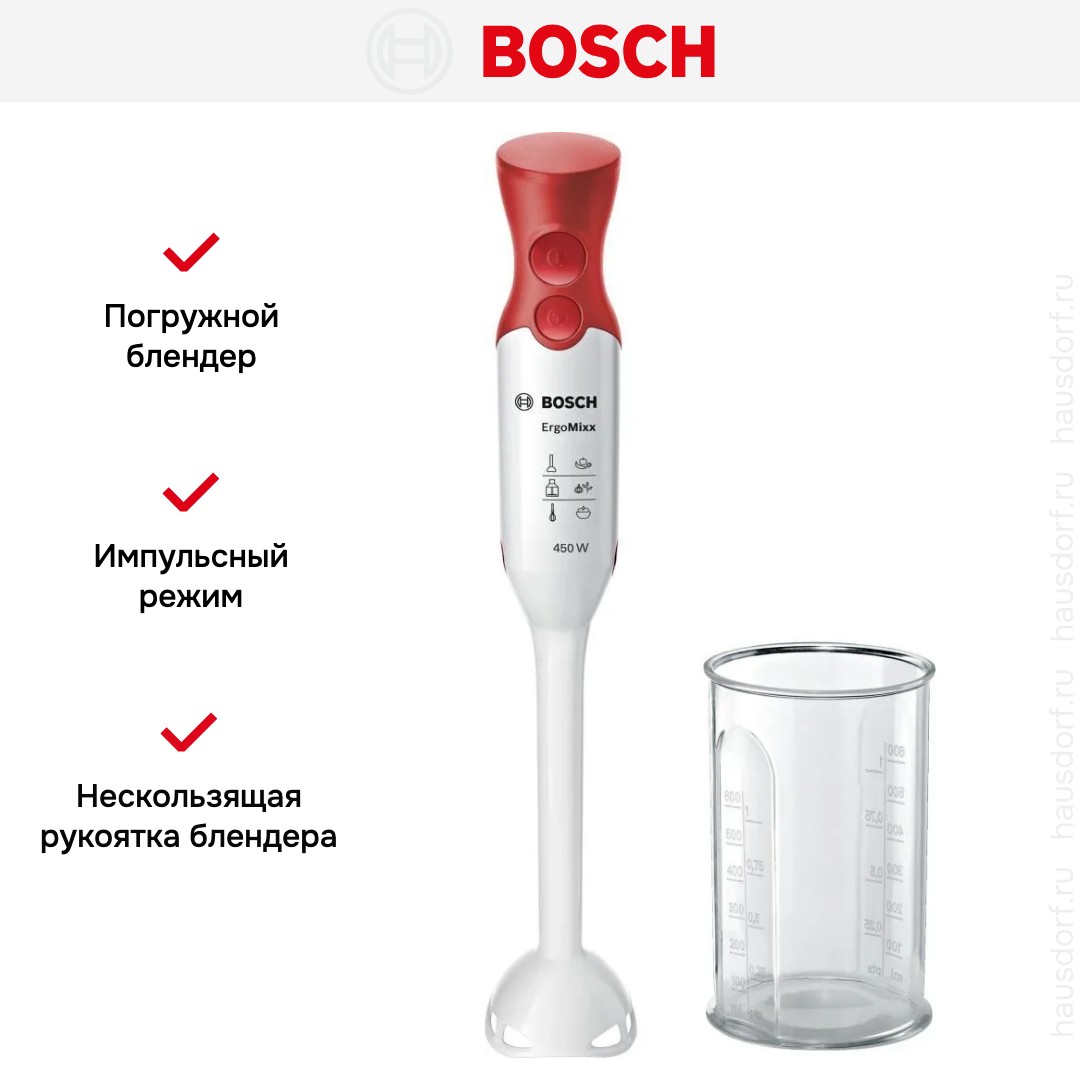 Погружной блендер Bosch позволяет готовить смузи, коктейли, смешивать соусы и заправки и многое другое. Такая конструкция требует вашего участия — нужно держать рукоятку с насадкой и контролировать направление движения. Плюс в том, что можно использовать ее прямо в кастрюле, когда готовите, например, суп-пюре. Корпус сделан в основном из пластика, что уменьшает вес прибора. Он может как влиться в общую гамму интерьера, так и стать ярким акцентом; доминирующий цвет — белый/красный.