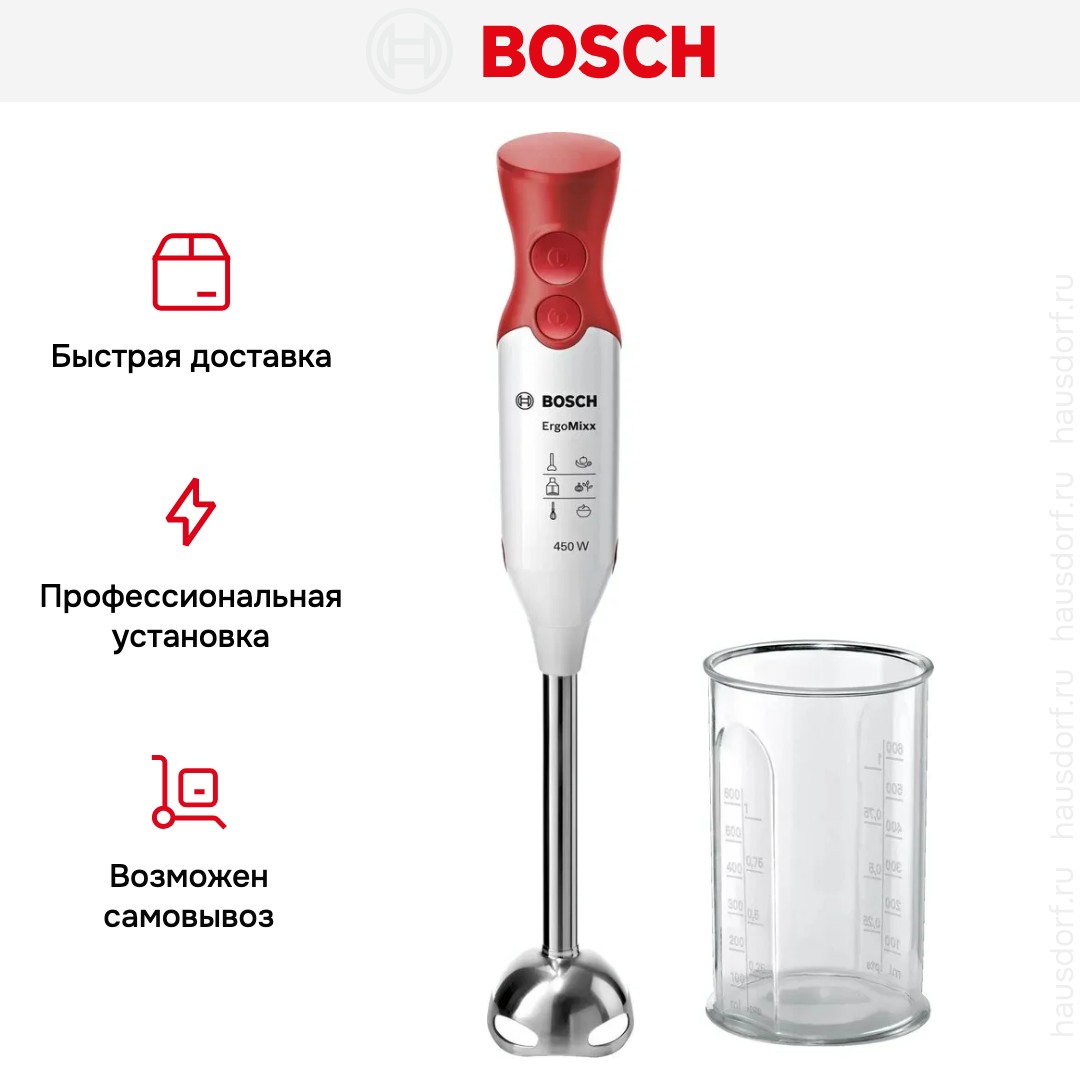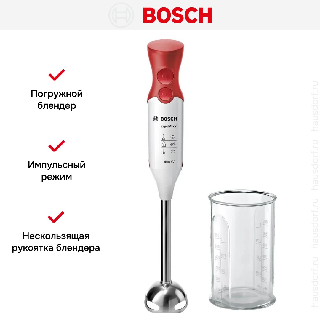 Погружной блендер Bosch позволяет готовить смузи, коктейли, смешивать соусы и заправки и многое другое. Такая конструкция требует вашего участия — нужно держать рукоятку с насадкой и контролировать направление движения. Плюс в том, что можно использовать ее прямо в кастрюле, когда готовите, например, суп-пюре. Корпус сделан в основном из пластика, что уменьшает вес прибора. Он может как влиться в общую гамму интерьера, так и стать ярким акцентом; доминирующий цвет — белый/красный.