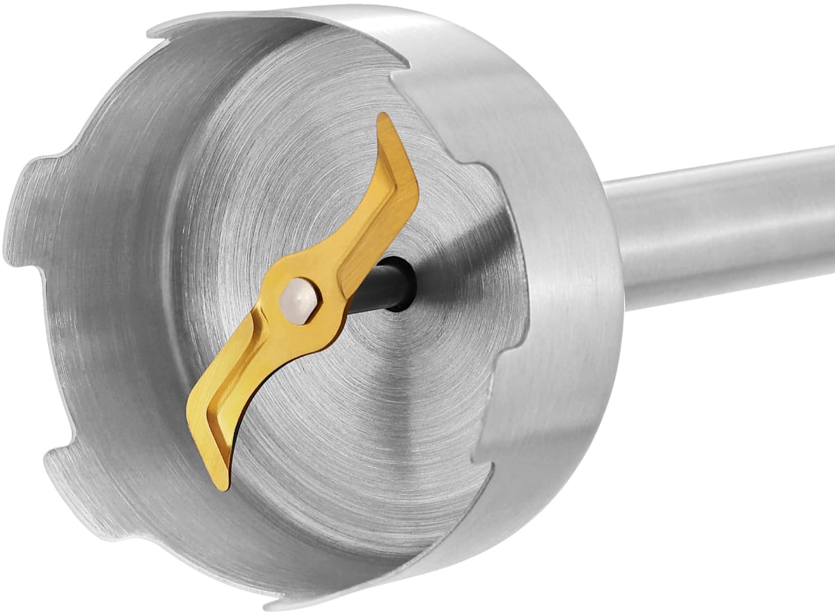 Погружной — мотор расположен в рукоятке, на конце которой есть насадка с венчиком или ножами. Вы опускаете ее в емкость и измельчаете продукты, удерживая прибор на месте, нажимая или проводя по кругу.