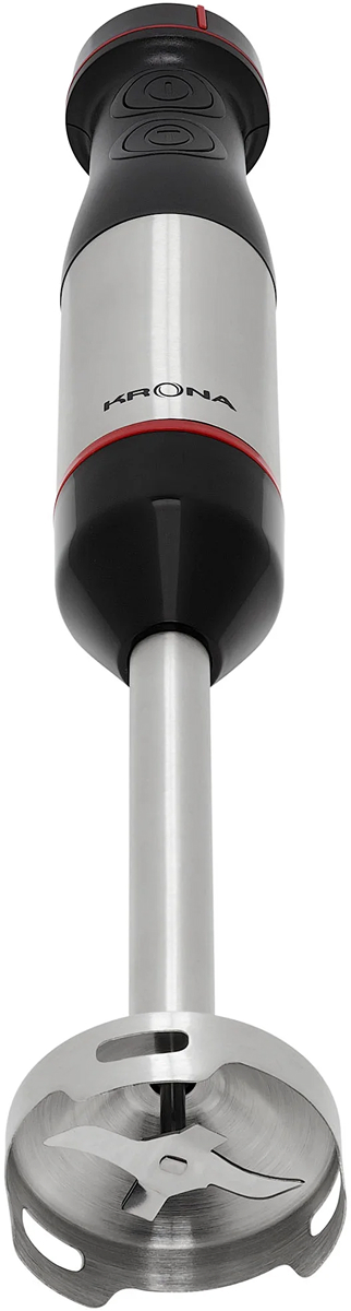 Погружной блендер KRONA позволяет готовить смузи, коктейли, смешивать соусы и заправки и многое другое. Такая конструкция требует вашего участия — нужно держать рукоятку с насадкой и контролировать направление движения. Плюс в том, что можно использовать ее прямо в кастрюле, когда готовите, например, суп-пюре. Корпус сделан в основном из пластика, что уменьшает вес прибора. Он может как влиться в общую гамму интерьера, так и стать ярким акцентом; доминирующий цвет — черный/нержавеющая сталь.