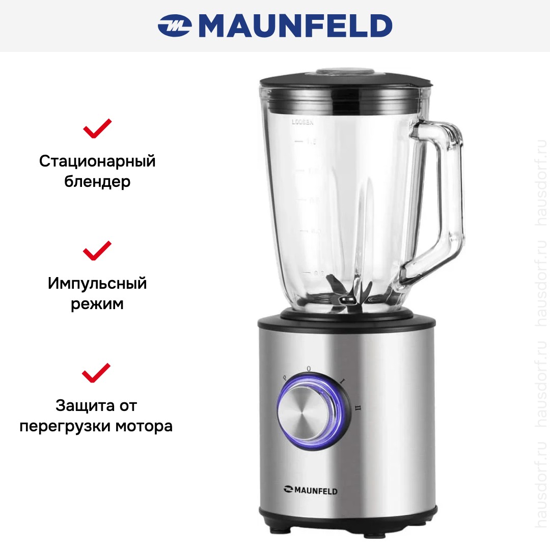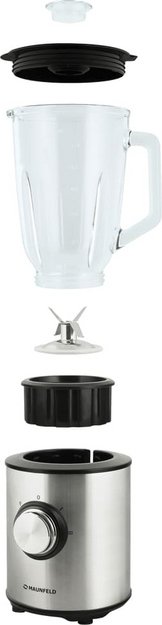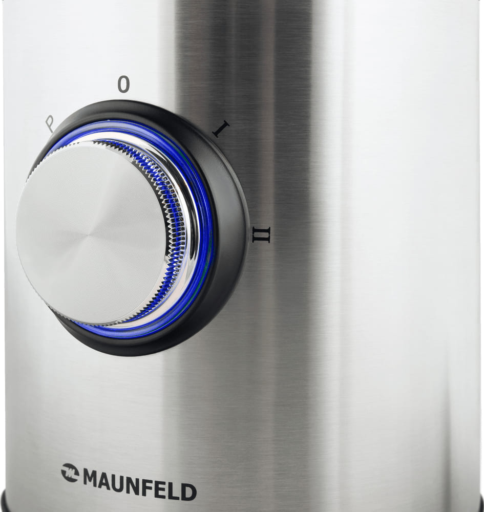 Стационарный блендер Maunfeld позволяет готовить смузи, коктейли, смешивать соусы и заправки, измельчать продукты до состояния пюре и многое другое. Его конструкция подразумевает автономную работу — вам нужно только положить овощи или фрукты и выбрать режим. Корпус сделан в основном из металла, что повышает надежность прибора. Он может как влиться в общую гамму интерьера, так и стать ярким акцентом; доминирующий цвет — нержавеющая сталь. Благодаря специальным нескользящим ножкам блендер сохраняет устойчивость даже на высоких оборотах.
