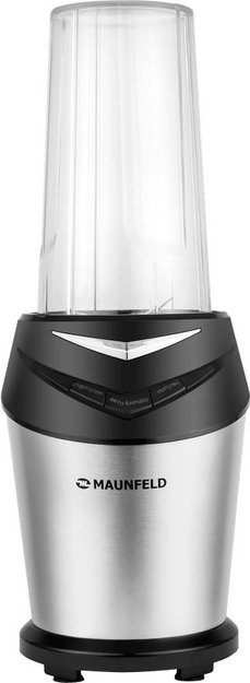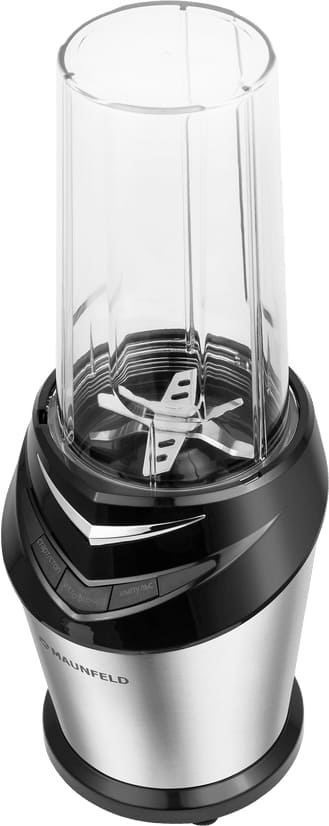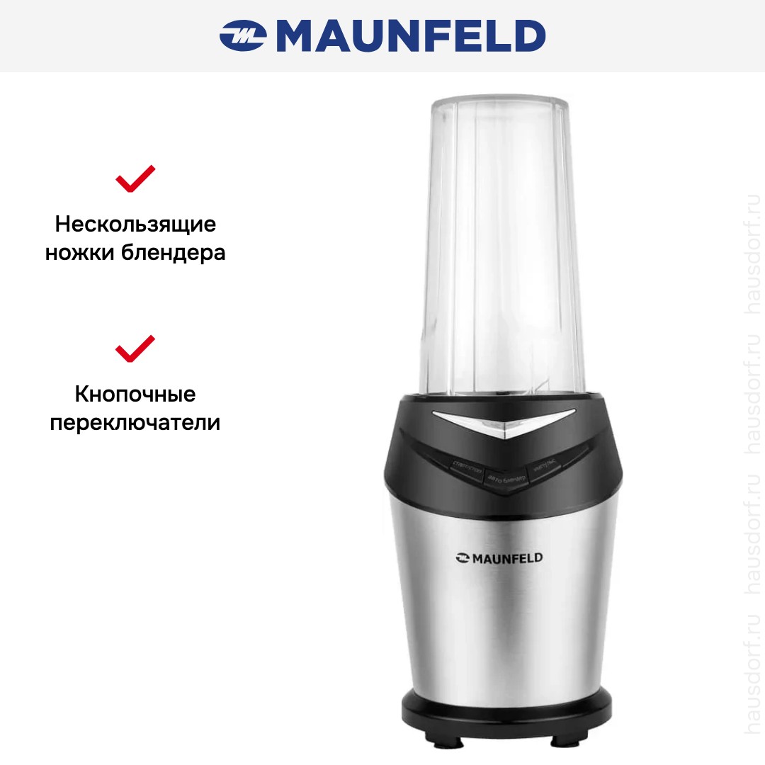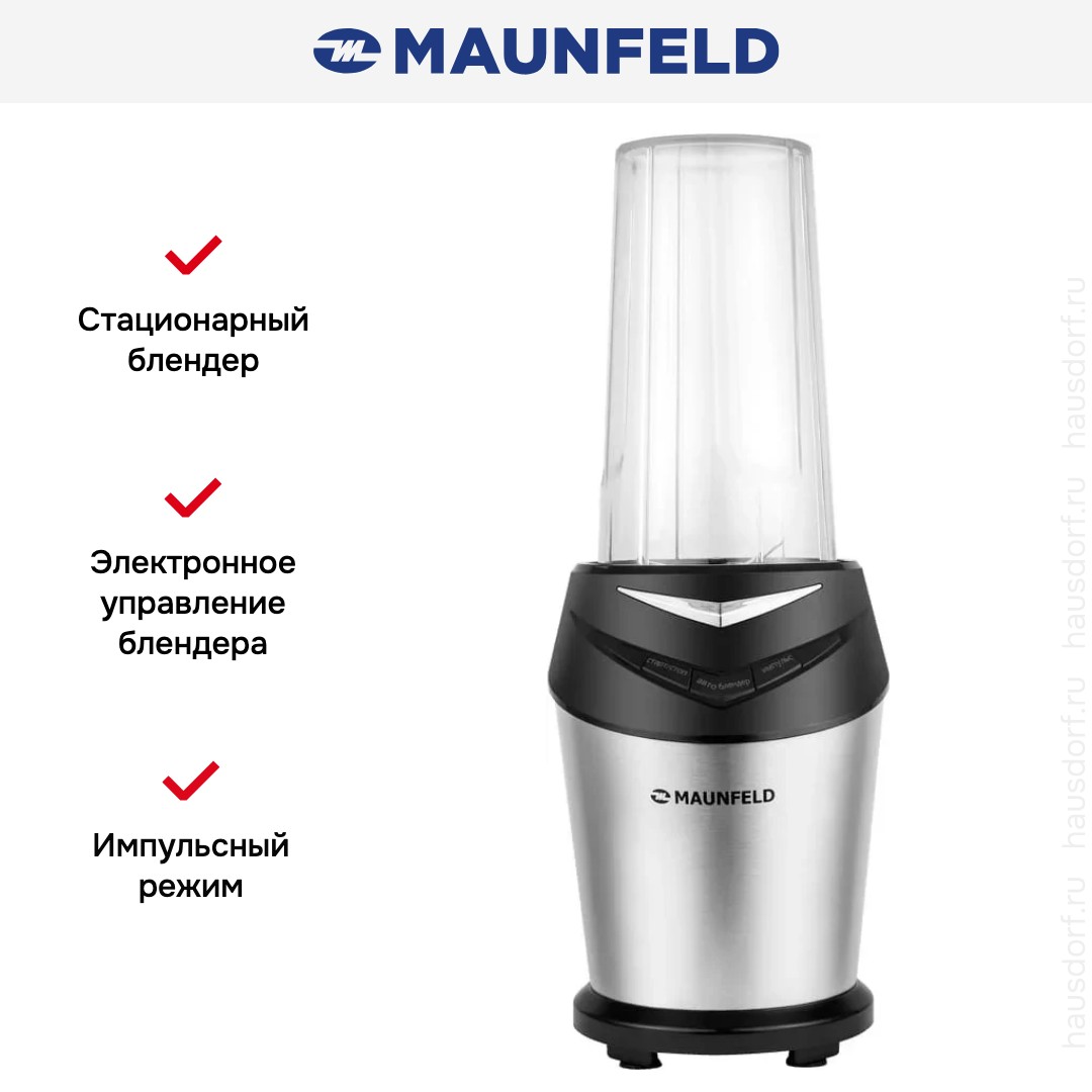 Стационарный блендер Maunfeld позволяет готовить смузи, коктейли, смешивать соусы и заправки, измельчать продукты до состояния пюре и многое другое. Его конструкция подразумевает автономную работу — вам нужно только положить овощи или фрукты и выбрать режим. Корпус сделан в основном из металла, что повышает надежность прибора. Он может как влиться в общую гамму интерьера, так и стать ярким акцентом; доминирующий цвет — нержавеющая сталь. Благодаря специальным нескользящим ножкам блендер сохраняет устойчивость даже на высоких оборотах.