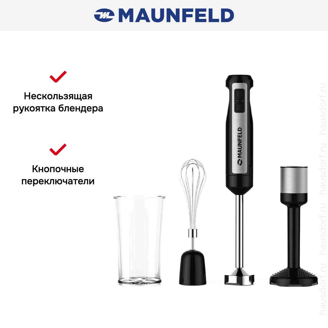 Погружной блендер Maunfeld MF-133B сочетает мощность и компактность для повседневных задач. Его строгий чёрный корпус выполнен из лёгкого пластика, который снижает общий вес прибора и делает его удобным при длительном использовании. Благодаря своим габаритам и минималистичному дизайну техника не займет много места на полке, что удобно при хранении.