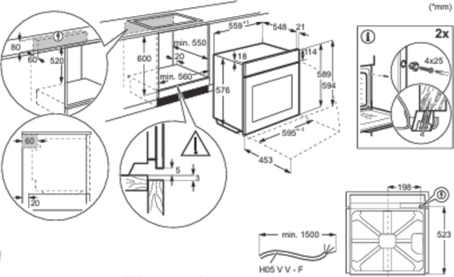 При установке требуется строго соблюдать правила техники безопасности — в частности, выдерживать размеры всех зазоров между стенками духовки и стенками мебели, необходимые для беспрепятственной циркуляции воздуха. Так, расстояние до боковых стенок мебели должно составлять не менее 0,5–1 см, а до задней стенки — не менее 4–5 см.