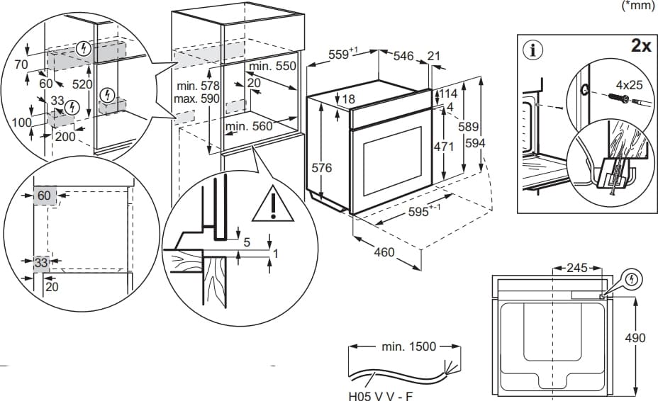 Габариты устройства составляют 59,4 см в высоту, 59,5 см в ширину и 56,7 см в глубину — параметры, полностью соответствующие европейским стандартам для встраиваемой техники. Такие размеры обеспечивают лёгкую интеграцию в большинство кухонных гарнитуров. Для корректного монтажа требуется ниша высотой от 57,8 до 59 см, шириной 56 см и глубиной 55 см, что обеспечивает плотную фиксацию, аккуратный внешний вид и необходимую вентиляцию. Гибкий диапазон по высоте упрощает установку в различные типы мебели и позволяет компенсировать небольшие погрешности при изготовлении кухонного проёма.