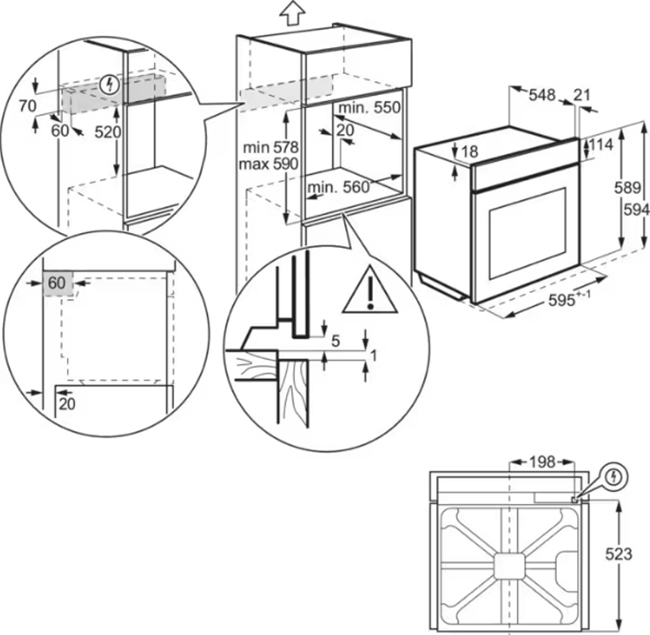 При установке требуется строго соблюдать правила техники безопасности — в частности, выдерживать размеры всех зазоров между стенками духовки и стенками мебели, необходимые для беспрепятственной циркуляции воздуха. Так, расстояние до боковых стенок мебели должно составлять не менее 0,5–1 см, а до задней стенки — не менее 4–5 см.
