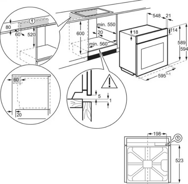 При установке требуется строго соблюдать правила техники безопасности — в частности, выдерживать размеры всех зазоров между стенками духовки и стенками мебели, необходимые для беспрепятственной циркуляции воздуха. Так, расстояние до боковых стенок мебели должно составлять не менее 0,5–1 см, а до задней стенки — не менее 4–5 см.