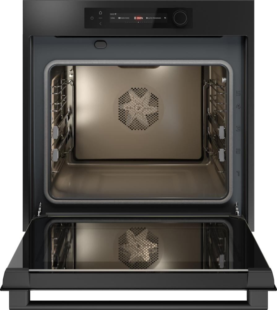 Особенности дизайна и внешней панели управления — также важный пункт при выборе духовки на кухню. В данной модели нужно обратить внимание на цвет — графит, охлаждение двери, чтобы поверхность и мебель вокруг не нагревались.