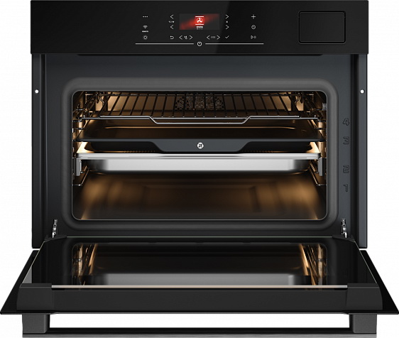 Особенности дизайна и внешней панели управления — также важный пункт при выборе духовки на кухню. В данной модели нужно обратить внимание на цвет — черное стекло, охлаждение двери, чтобы поверхность и мебель вокруг не нагревались.