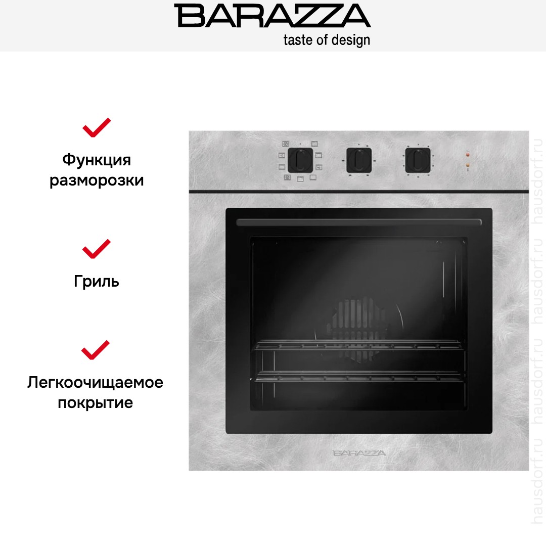 Количество режимов работы в духовом шкафу Баразза: 8. В число доступных программ входят: классический нагрев, верхний нагрев, нижний нагрев, конвекция, гриль для создания хрустящей корочки, и другие. Помимо основных программ воспользуйтесь специальными возможностями этого прибора: размораживанием продуктов, чтобы сократить время на подготовку; быстрым разогревом для ускорения работы; и другими. Тип гриля в этой модели — электрический.