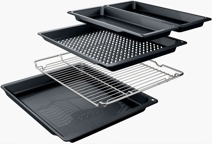 В стандартную комплектацию любого духового шкафа входят один или два противня — эмалированных или с антипригарным покрытием — и решетка. Единственный противень, как правило, имеет низкие бортики и предназначается для приготовления выпечки. Если духовка комплектуется двумя противнями, то второй отличается более высокими бортиками — его можно использовать для запекания мяса, птицы, овощных блюд. На решетке в духовке, не оснащенной грилем, обычно устанавливаются формы для запекания — стальные, керамические или стеклянные. В духовках премиум-класса количество противней может быть увеличено: к стандартному комплекту добавляются противни с перфорацией для мяса, специальные поддоны для сбора выделившегося сока.