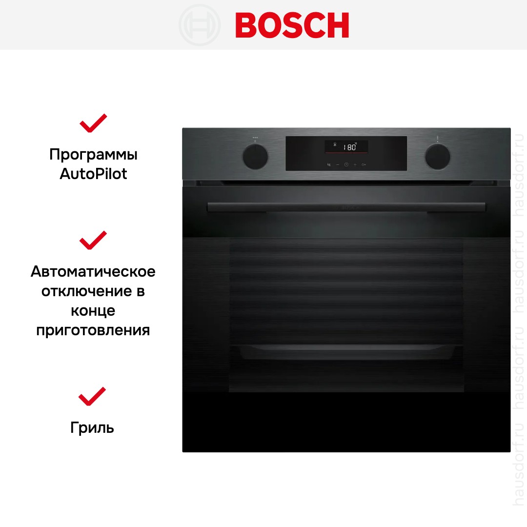 Количество режимов работы в духовом шкафу Бош: 8. В число доступных программ входят: классический нагрев, нижний нагрев, гриль для создания хрустящей корочки, пицца, и другие. Тип гриля в этой модели — электрический.