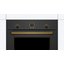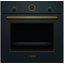 Электрический духовой шкаф легко встроить в нишу как под варочную панель, так и вместе с микроволновкой или пароваркой в своеобразную «колонну». Фронтальная часть выполнена в классическом дизайне: черное матовое покрытие, золотистая отделка фурнитуры и смотрового окошка, аналоговые часы и поворотные регуляторы.