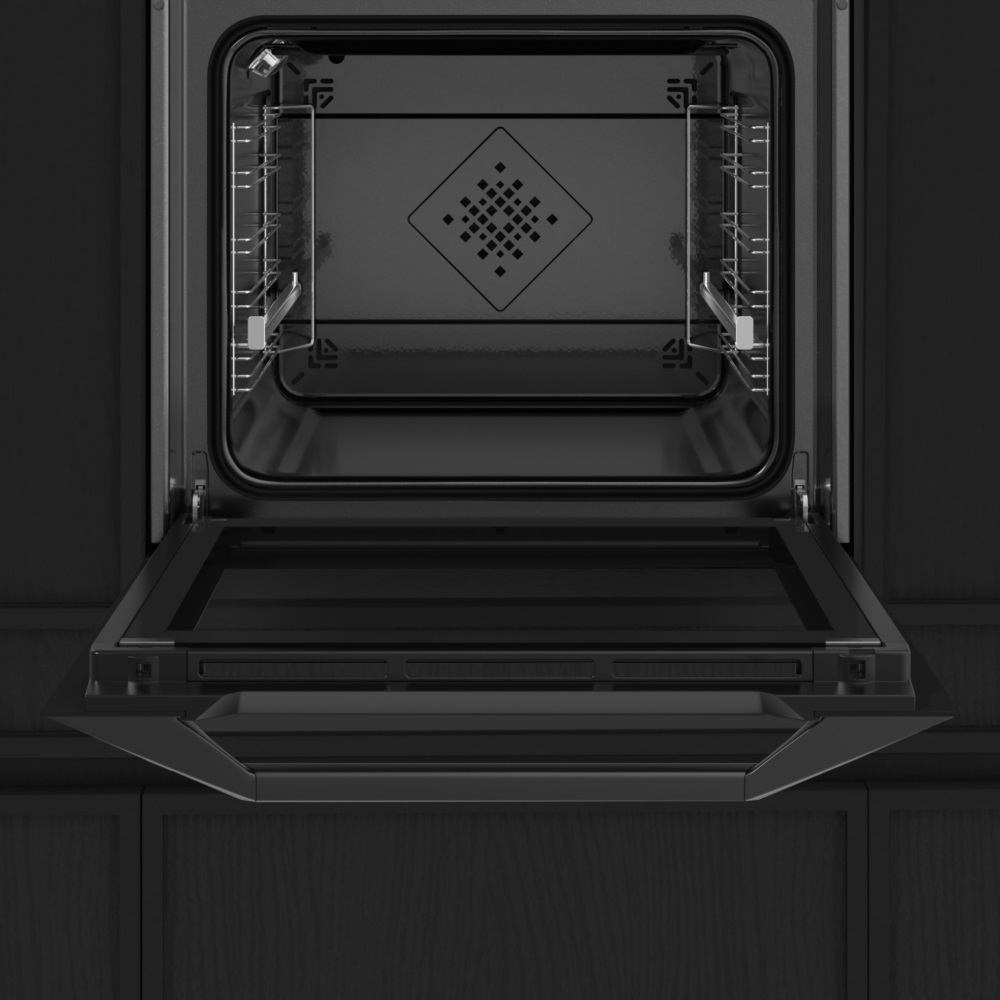 Особенности дизайна и внешней панели управления — также важный пункт при выборе духовки на кухню. В данной модели нужно обратить внимание на цвет — черный,