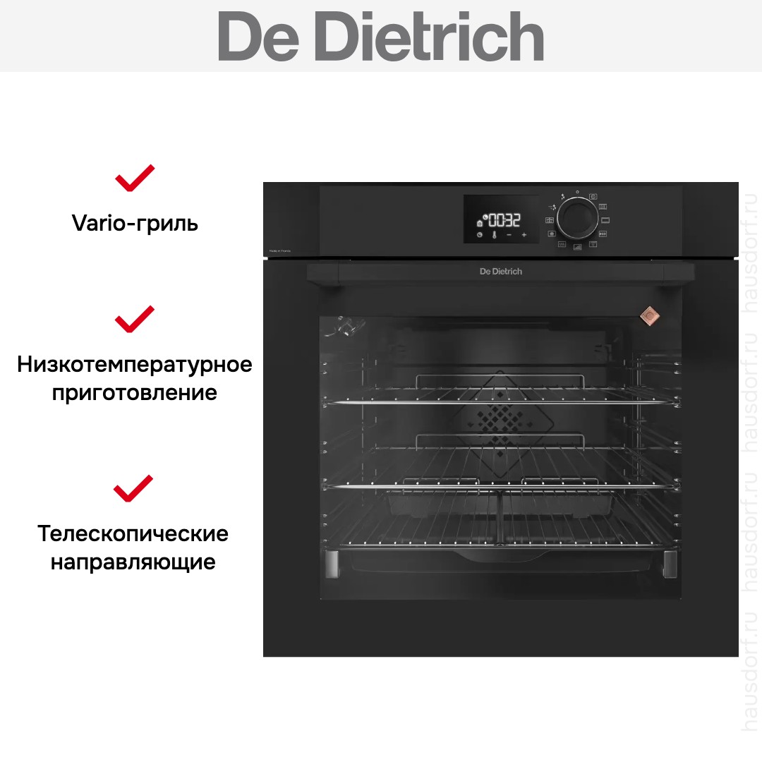 Количество режимов работы в духовом шкафу Де Дитрих: 9. В число доступных программ входят: конвекция, гриль для создания хрустящей корочки, и другие. Тип гриля в этой модели — электрический.