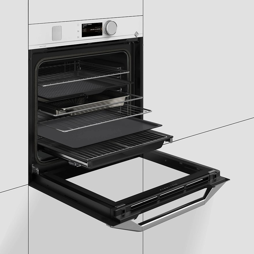 Особенности дизайна и внешней панели управления — также важный пункт при выборе духовки на кухню. В данной модели нужно обратить внимание на цвет — белый, охлаждение двери, чтобы поверхность и мебель вокруг не нагревались.