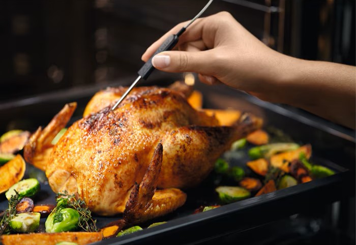 Термощуп в духовых шкафах Electrolux — это электронный термометр, который способен определить температуру внутри готовящихся блюд. Острый конец термощупа с температурным датчиком, температура измеряется непрерывно, а по достижении заданного значения духовка отключается автоматически.