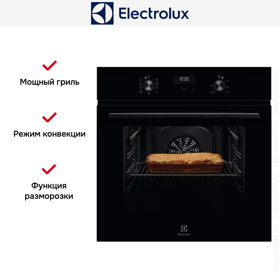 Готовьте свои лучшие блюда и пробуйте новые рецепты с духовым шкафом Electrolux EOF5H50BZ! Стандартные размеры и большой объем внутренней камеры — выбор тех, кто много готовит для семьи или частых праздничных встреч с друзьями. Желательно заранее продумать расположение такой модели в кухонном гарнитуре.