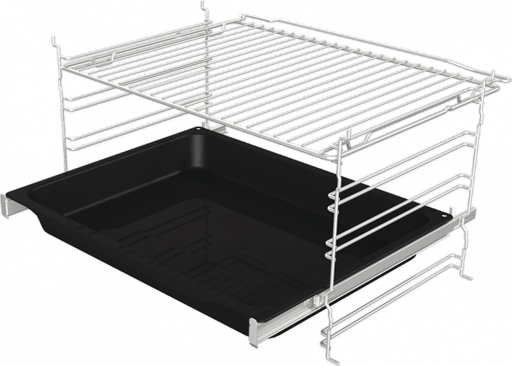 В стандартную комплектацию любого духового шкафа входят один или два противня — эмалированных или с антипригарным покрытием — и решетка. Единственный противень, как правило, имеет низкие бортики и предназначается для приготовления выпечки. Если духовка комплектуется двумя противнями, то второй отличается более высокими бортиками — его можно использовать для запекания мяса, птицы, овощных блюд. На решетке в духовке, не оснащенной грилем, обычно устанавливаются формы для запекания — стальные, керамические или стеклянные. В духовках премиум-класса количество противней может быть увеличено: к стандартному комплекту добавляются противни с перфорацией для мяса, специальные поддоны для сбора выделившегося сока.