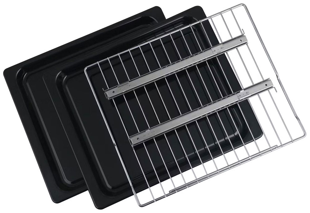 В стандартную комплектацию любого духового шкафа входят один или два противня — эмалированных или с антипригарным покрытием — и решетка. Единственный противень, как правило, имеет низкие бортики и предназначается для приготовления выпечки. Если духовка комплектуется двумя противнями, то второй отличается более высокими бортиками — его можно использовать для запекания мяса, птицы, овощных блюд. На решетке в духовке, не оснащенной грилем, обычно устанавливаются формы для запекания — стальные, керамические или стеклянные. В духовках премиум-класса количество противней может быть увеличено: к стандартному комплекту добавляются противни с перфорацией для мяса, специальные поддоны для сбора выделившегося сока.