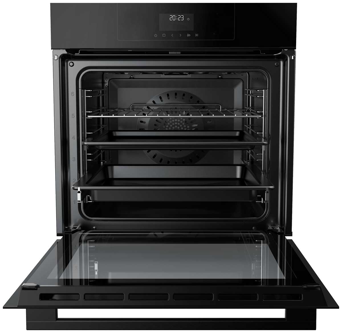 Особенности дизайна и внешней панели управления — также важный пункт при выборе духовки на кухню. В данной модели нужно обратить внимание на цвет — черный/тонированное черное стекло, охлаждение двери, чтобы поверхность и мебель вокруг не нагревались.