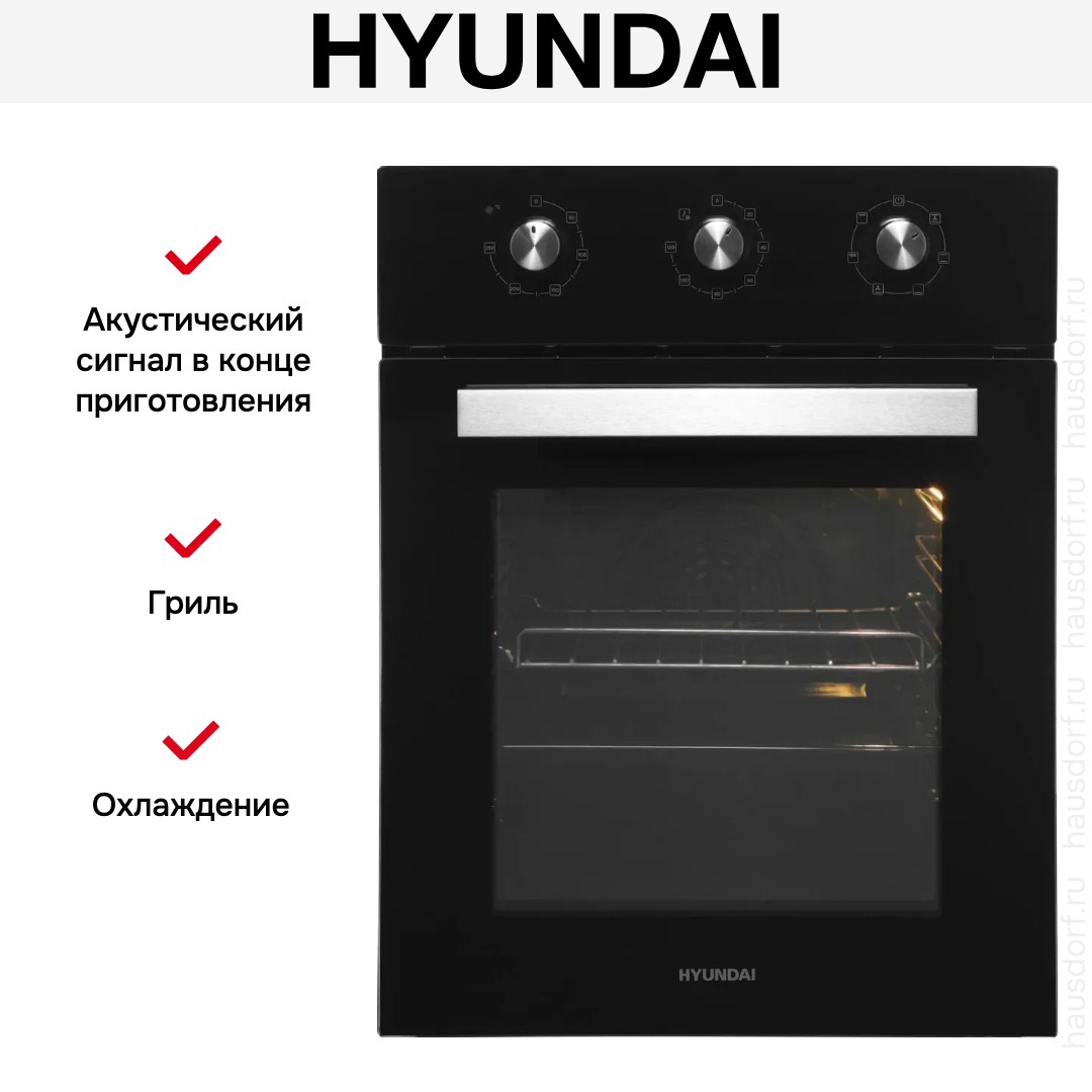 Количество режимов работы в духовом шкафу Хендай: 6. В число доступных программ входят: классический нагрев, нижний нагрев, гриль для создания хрустящей корочки, и другие. Тип гриля в этой модели — электрический.
