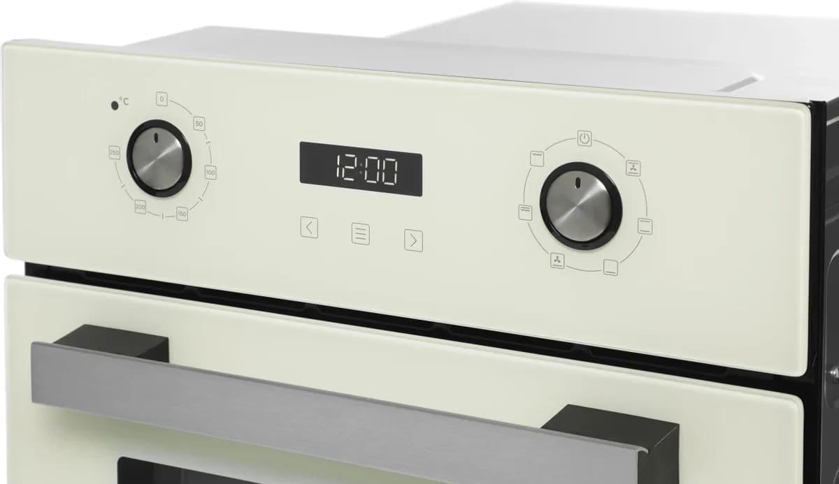 Особенности дизайна и внешней панели управления — также важный пункт при выборе духовки на кухню. В данной модели нужно обратить внимание на цвет — бежевое стекло, Механическая панель управления позволяет быстро разобраться в настройке программ и не требует чрезмерных усилий.
