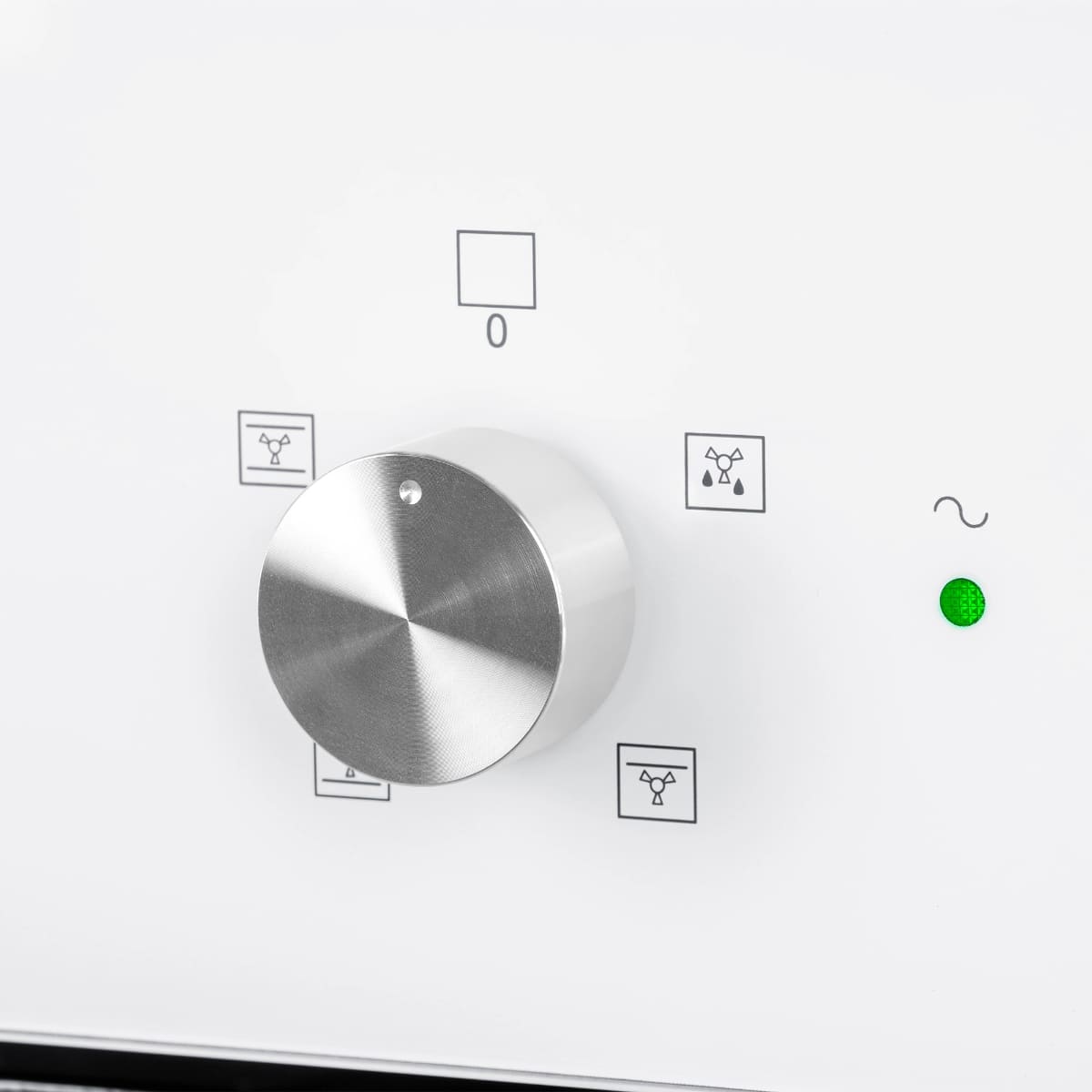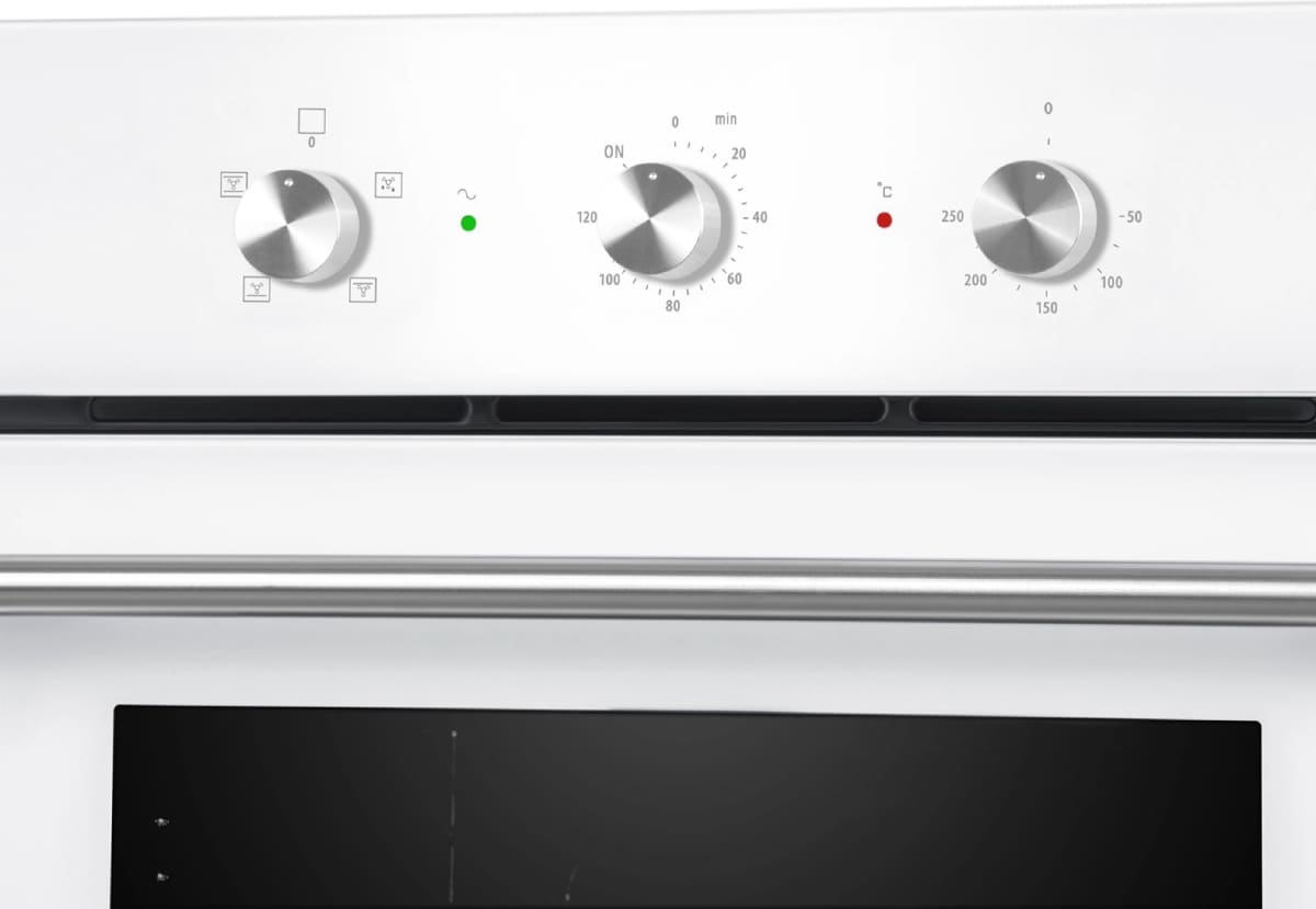 Особенности дизайна и внешней панели управления — также важный пункт при выборе духовки на кухню. В данной модели нужно обратить внимание на цвет — белый, Механическая панель управления позволяет быстро разобраться в настройке программ и не требует чрезмерных усилий.