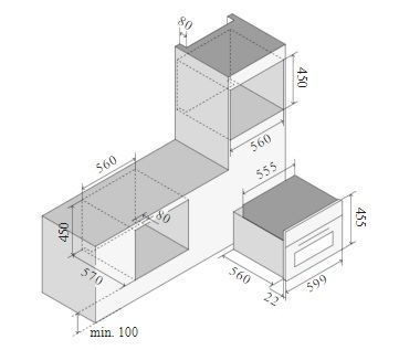 Размеры ниши для встраивания духового шкафа определяются, исходя из габаритов самого устройства. Стандартные модели обычно без труда устанавливаются в нишу шириной около 560 мм, высотой около 595 мм и глубиной примерно 550 мм. Следует помнить, что фасад устройства должен иметь большие размеры, чем величина ниши.