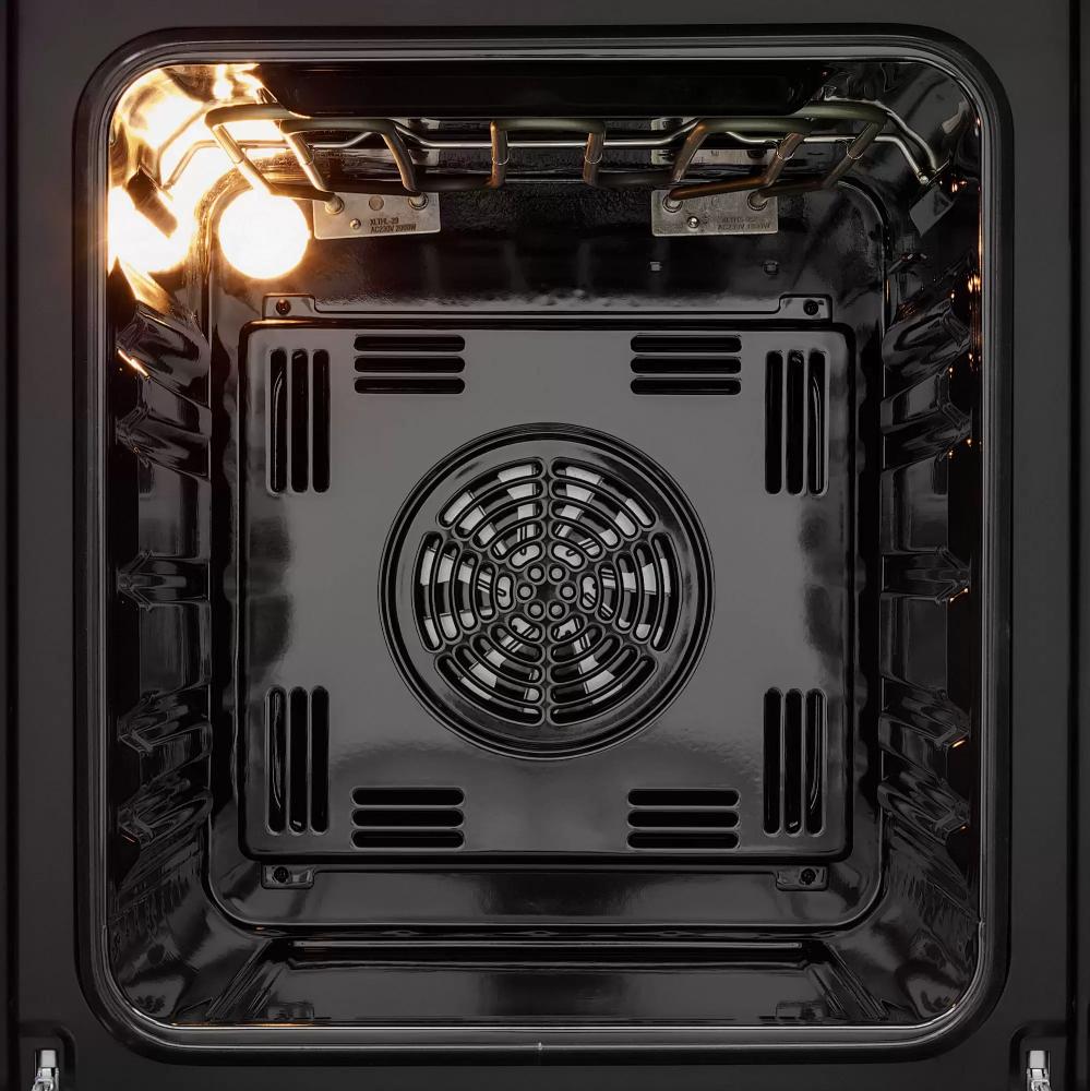 Нижний нагревательный элемент способствует быстрому повышению температуры воздуха в камере. В то же время начинает работать кольцевой нагревательный элемент на задней стенке камеры: расположенный внутри его контура вентилятор равномерно распространяет оба потока горячего воздуха по всему объему камеры. Таким образом, при размещении противня на третьем или втором уровне нижняя сторона блюда будет поджариваться за счет действия ТЭНа, а верхняя — запекаться под действием горячего воздуха, так что начинка всегда будет оставаться мягкой и сочной.