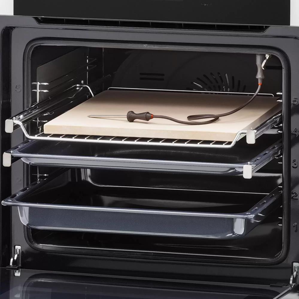 В стандартную комплектацию любого духового шкафа входят один или два противня — эмалированных или с антипригарным покрытием — и решетка. Единственный противень, как правило, имеет низкие бортики и предназначается для приготовления выпечки. Если духовка комплектуется двумя противнями, то второй отличается более высокими бортиками — его можно использовать для запекания мяса, птицы, овощных блюд. На решетке в духовке, не оснащенной грилем, обычно устанавливаются формы для запекания — стальные, керамические или стеклянные. В духовках премиум-класса количество противней может быть увеличено: к стандартному комплекту добавляются противни с перфорацией для мяса, специальные поддоны для сбора выделившегося сока.