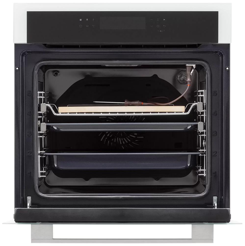 Особенности дизайна и внешней панели управления — также важный пункт при выборе духовки на кухню. В данной модели нужно обратить внимание на цвет — белый,