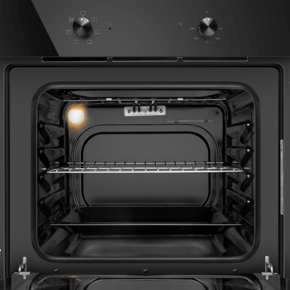 Как известно, стандартная ширина кухонной тумбы составляет около 60 см — поэтому за стандартную ширину встраиваемого духового шкафа принимают 59,5 см. Такие духовки имеют по 3–4 уровня приготовления, в них можно приготовить достаточно объемные блюда. Минимальное значение ширины духовки также соотносится с размерами тумбы для встраивания — оно составляет 44–45 см. Это хороший выбор для небольшой кухни, однако узкие духовые шкафы имеют свои недостатки — в частности, в них невозможно приготовить большой пирог или торт, запечь целый окорок, индейку или большую рыбу.