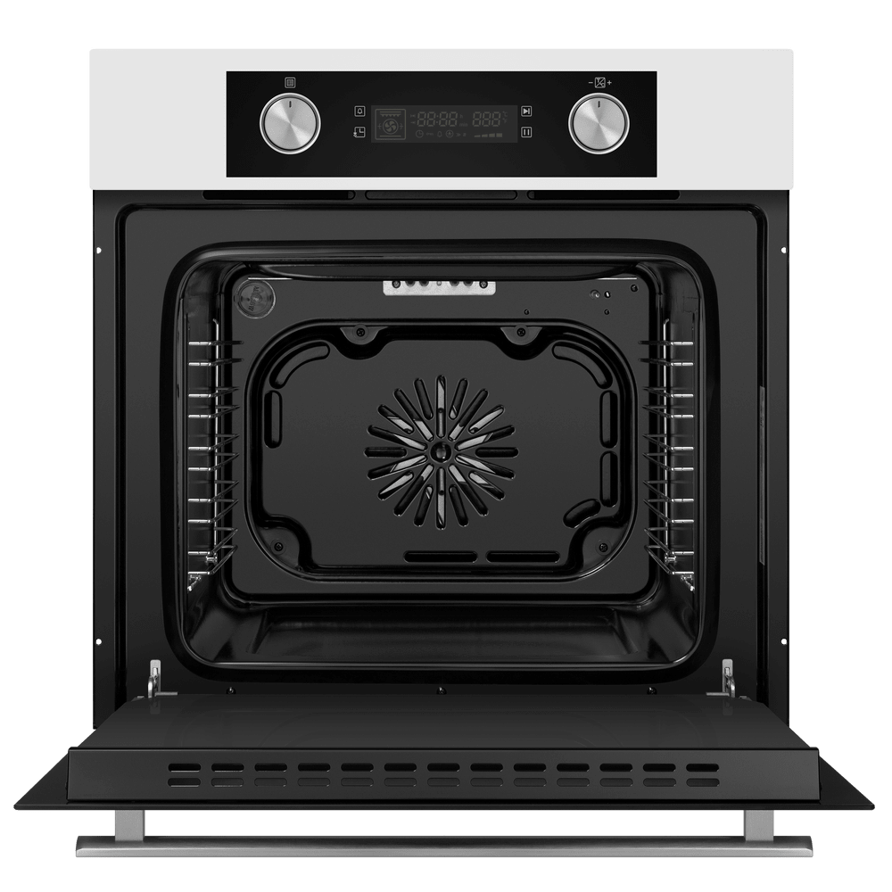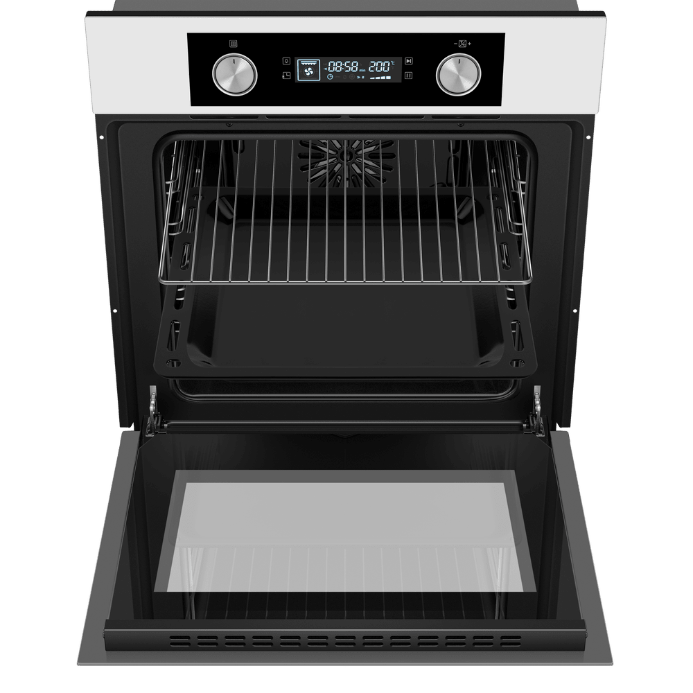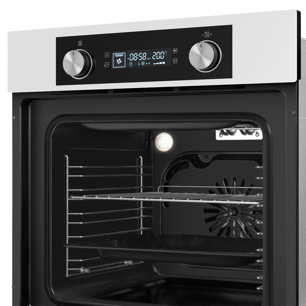Особенности дизайна и внешней панели управления — также важный пункт при выборе духовки на кухню. В данной модели нужно обратить внимание на цвет — белый,