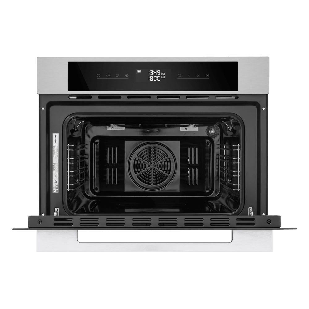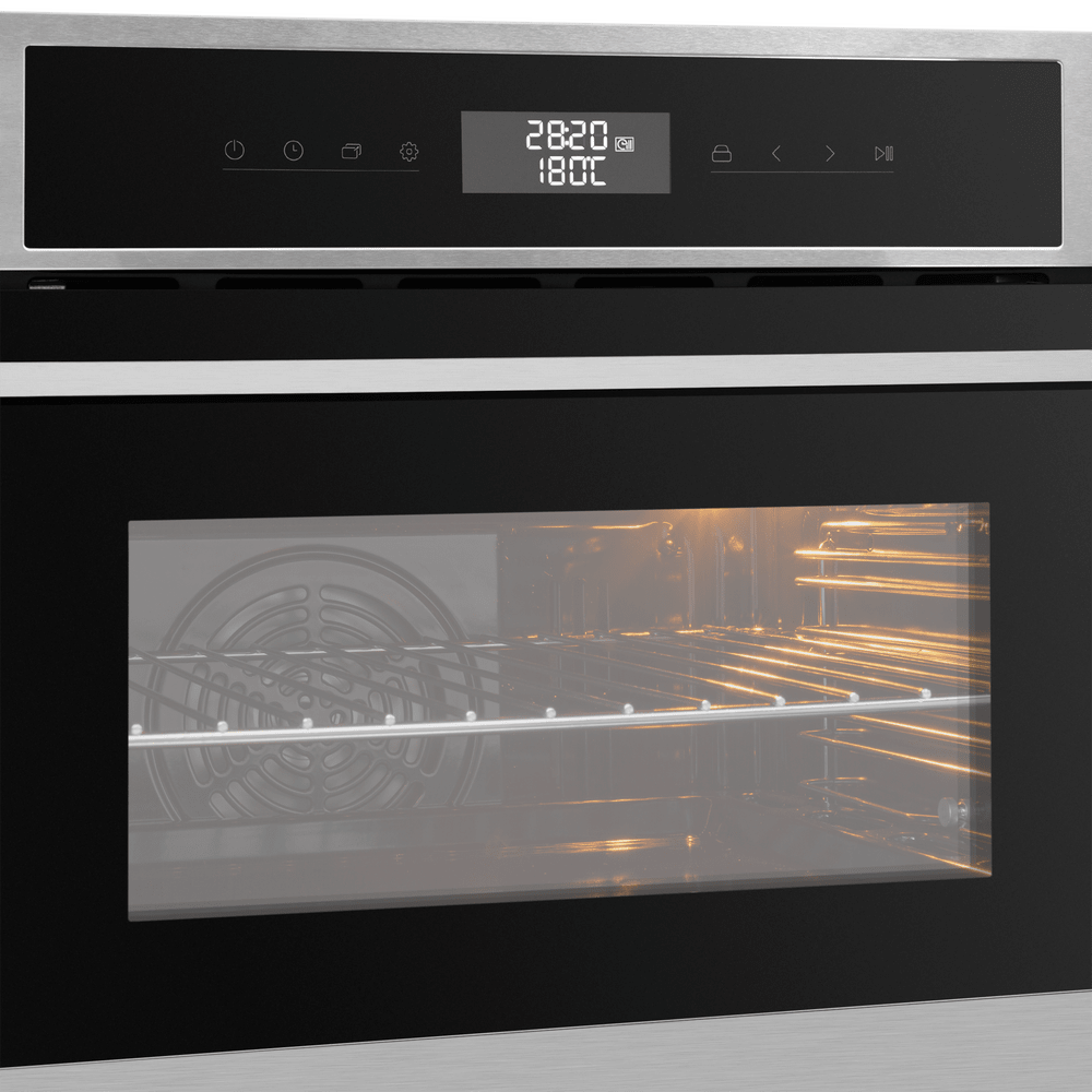 MAUNFELD AMCO458S — компактная независимая электрическая духовка с фасадом из нержавеющей стали. Удобная ручка-рейлинг также выполнена из стали, сенсорные кнопки и встроенный дисплей читаются ясно, а откидная дверца с тремя стеклами темного оттенка создаёт впечатление продуманной сборки и надёжной теплоизоляции.