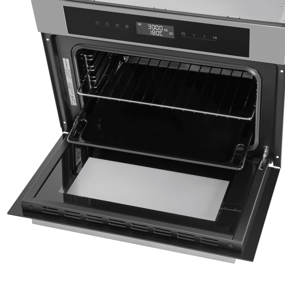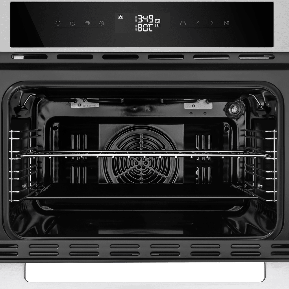 Внутренний объём камеры 45 литров позволяет разместить противни на четырёх уровнях одновременно. Восемь рабочих режимов включают верхний и нижний нагрев, конвекцию, режим «пицца», интенсивное жарение и гриль; доступны комбинации конвекции с верхним и с нижним подогревом. Для сокращения времени готовки предусмотрена функция быстрого разогрева. Внутренняя поверхность покрыта эмалью лёгкой очистки, что упрощает уход после эксплуатации. Основная очистка осуществляется каталитическим способом: специальные панели разлагают жир и продукты горения на золу и воду, так что после их достаточно просто протереть.