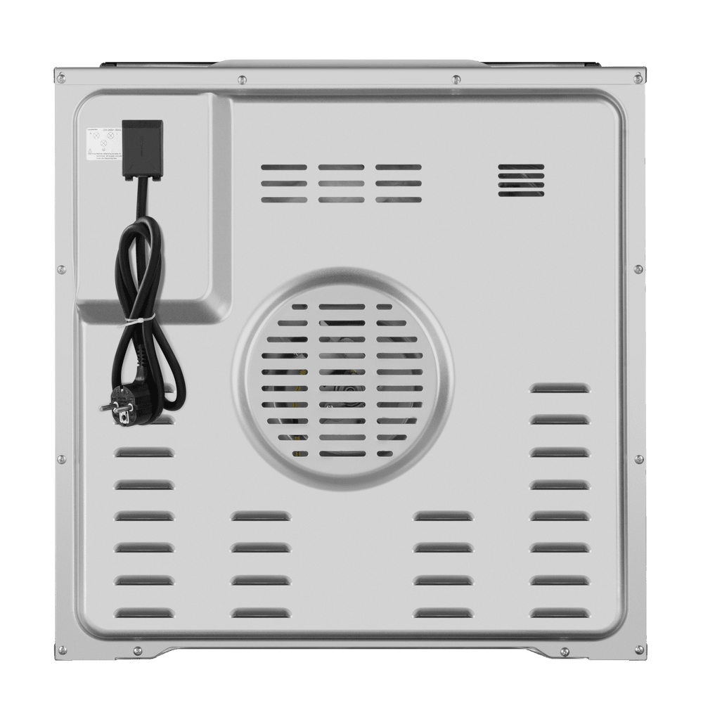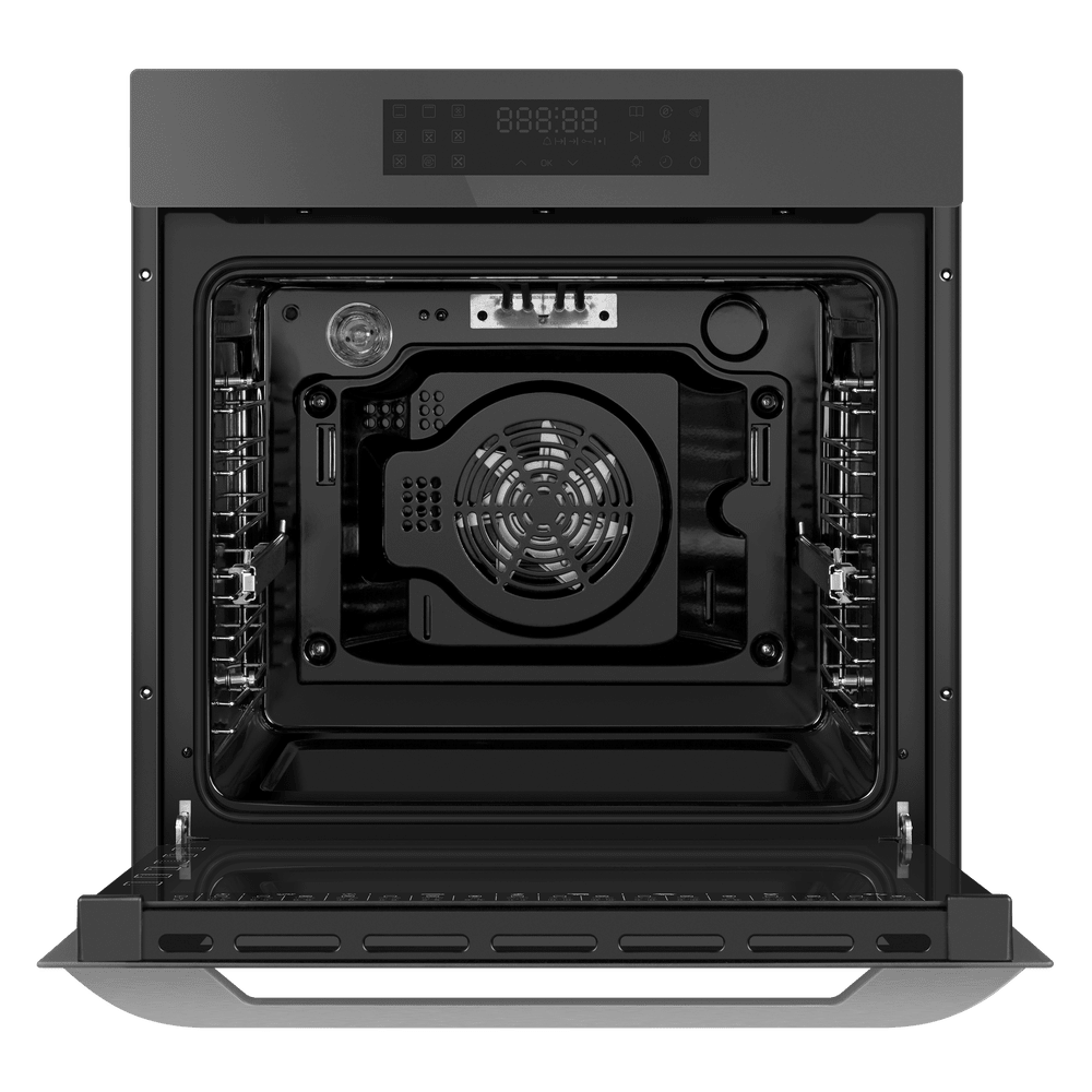 Габариты устройства составляют 59.5×59.5×57.5 см, а для встроенного монтажа предусмотрена ниша размером 60×56.4×59 см, что упрощает планировку и позволяет точно подобрать место в существующей обстановке. Объём рабочей камеры — 76 литров, внутри предусмотрено пять уровней для установки противней и решёток, так что крупные блюда и многоуровневое приготовление не станут проблемой.