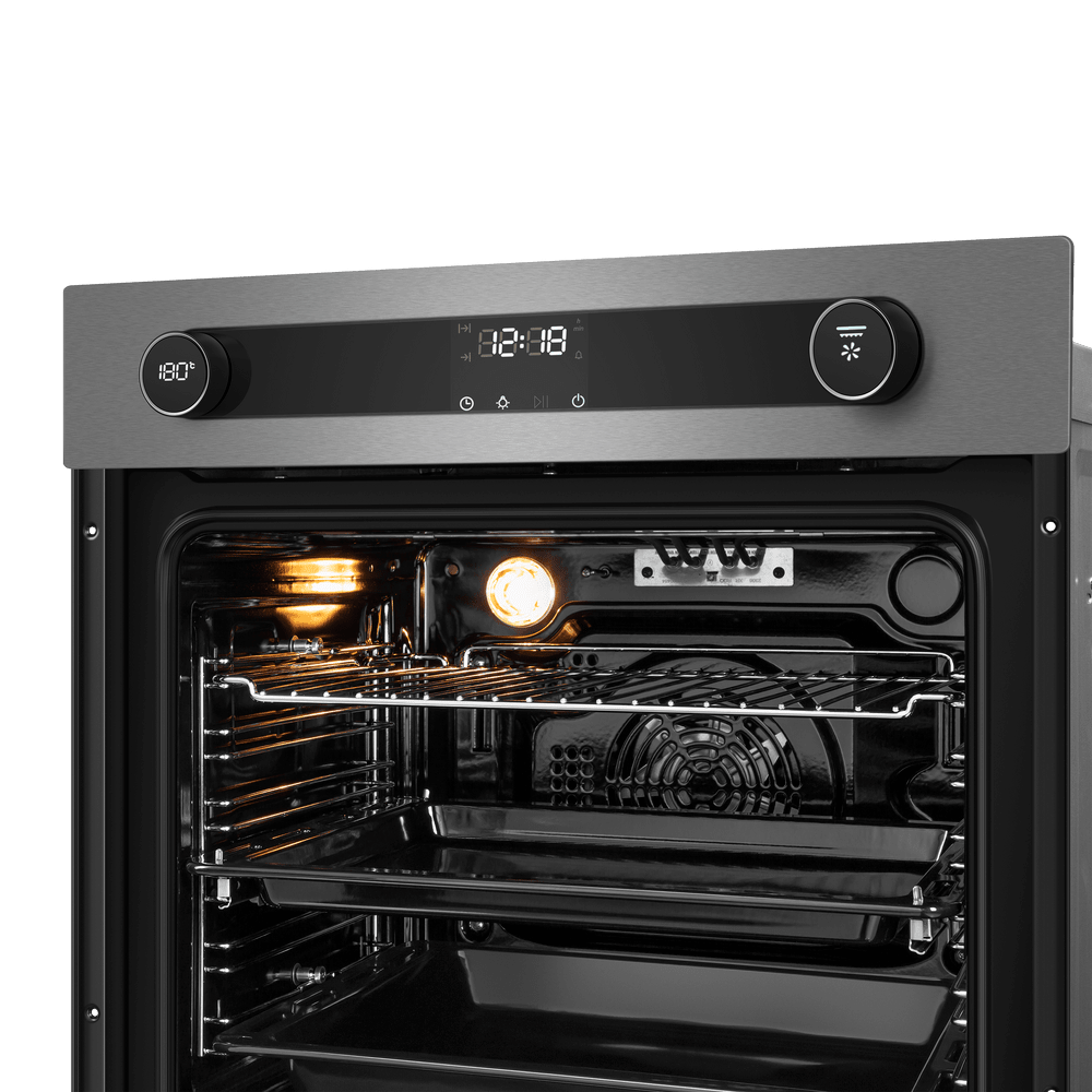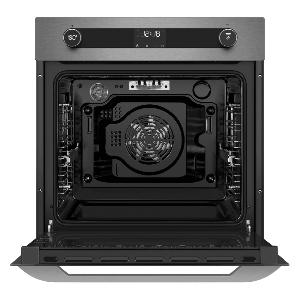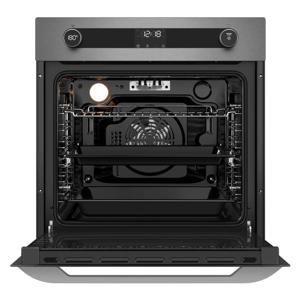 Функционал разнообразен, в него входят 15 режимов: классический нагрев, отдельно нижний нагрев, конвекция, режим выпечки пиццы, приготовление на гриле обычное и с добавлением горячего воздуха, а также сочетание конвекции с нижним нагревом. Такой богатый выбор позволяет готовить самые разные блюда, использовать любые кулинарные приемы, получать вкусную корочку, выпекать и жарить. Удобство встраивания в обычную кухонную мебель обеспечивают габариты 59.5×59.5×57.5 см.