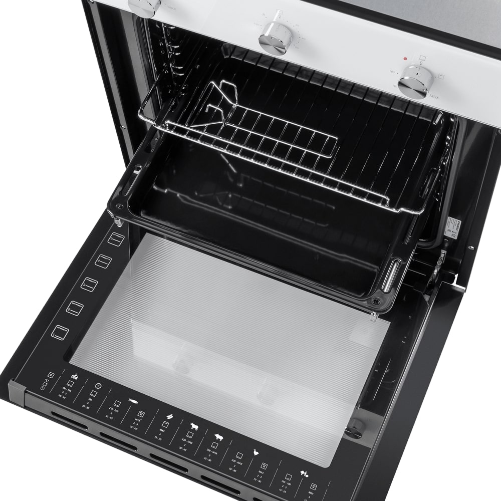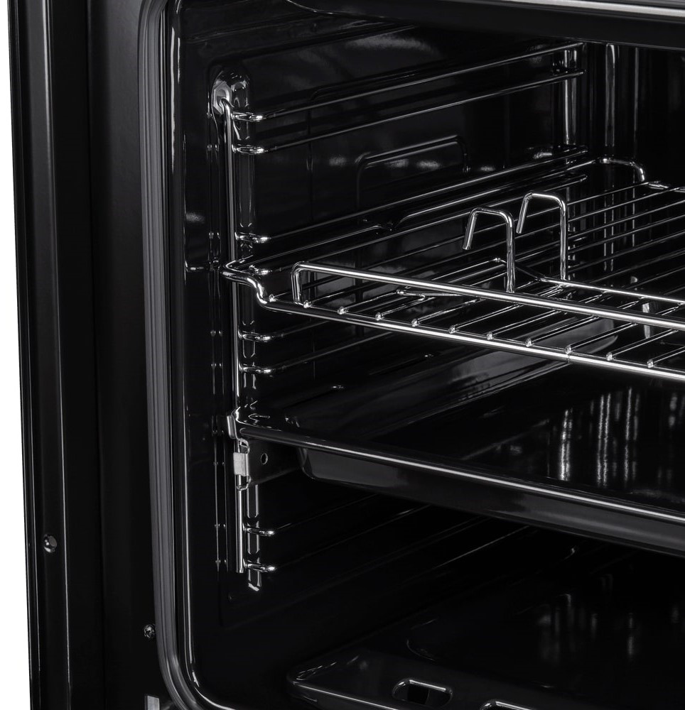 Практичность продумана до мелочей. Покрытие камеры — эмаль, с которой легче удалять следы приготовления; система очистки традиционная. Один уровень телескопических направляющих облегчает выдвижение посуды, в комплекте есть решетка и противень; при необходимости можно докупить глубокий поддон. Газ-контроль повышает безопасность в процессе.