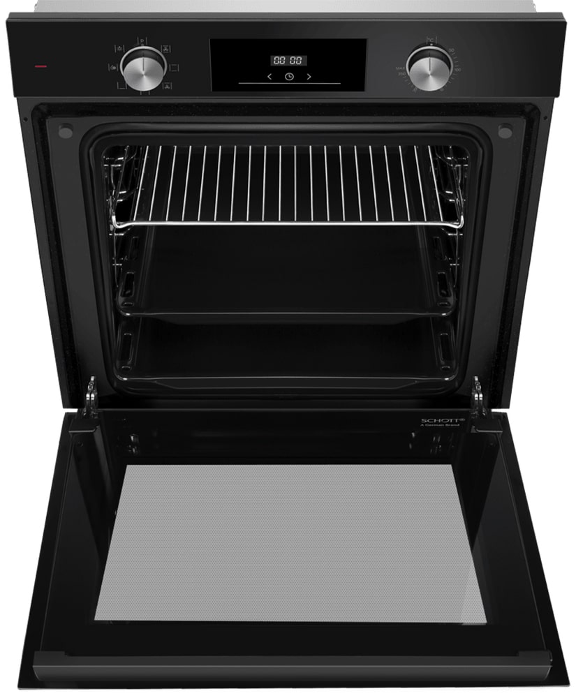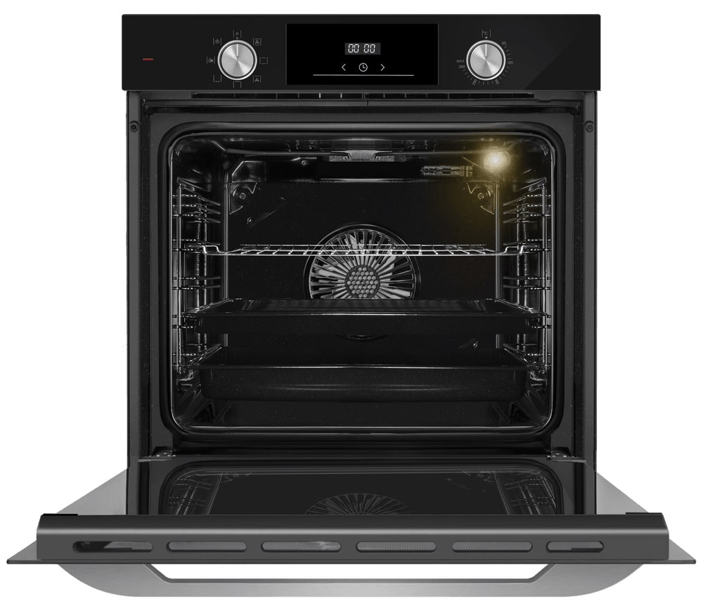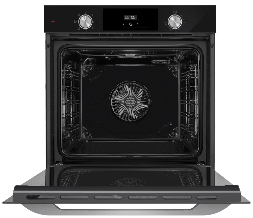 Строгий чёрный корпус в сочетании с фурнитурой из нержавеющей стали подчёркивает современный минималистический дизайн устройства. Утопленные поворотные регуляторы и сенсорные кнопки TouchControl создают аккуратную фронтальную панель с цифровым дисплеем. Откидная дверь с тремя слоями стекла сохраняет тепло и вписывается в интерьер в стиле хай‑тек, лофт или классическую кухню как контрастная деталь. Встраиваемые габариты 59.5×59.5×57 см позволяют разместить шкаф в стандартной мебельной нише, обеспечив вентиляцию.
