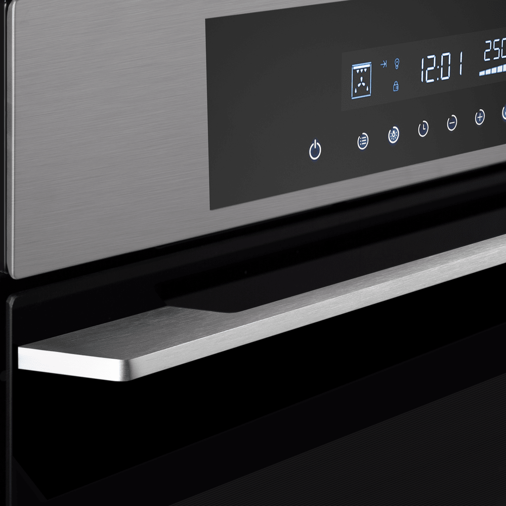 Особенности дизайна и внешней панели управления — также важный пункт при выборе духовки на кухню. В данной модели нужно обратить внимание на цвет — нержавеющая сталь,