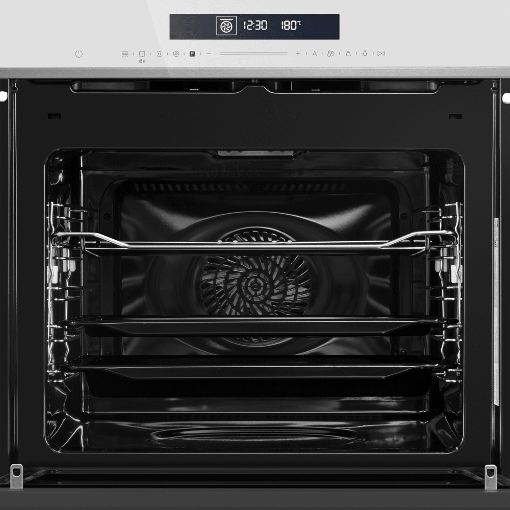 Особенности дизайна и внешней панели управления — также важный пункт при выборе духовки на кухню. В данной модели нужно обратить внимание на цвет — белый, охлаждение двери, чтобы поверхность и мебель вокруг не нагревались.
