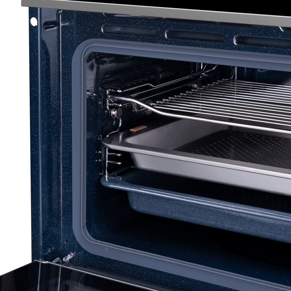В стандартную комплектацию любого духового шкафа входят один или два противня — эмалированных или с антипригарным покрытием — и решетка. Единственный противень, как правило, имеет низкие бортики и предназначается для приготовления выпечки. Если духовка комплектуется двумя противнями, то второй отличается более высокими бортиками — его можно использовать для запекания мяса, птицы, овощных блюд. На решетке в духовке, не оснащенной грилем, обычно устанавливаются формы для запекания — стальные, керамические или стеклянные. В духовках премиум-класса количество противней может быть увеличено: к стандартному комплекту добавляются противни с перфорацией для мяса, специальные поддоны для сбора выделившегося сока.