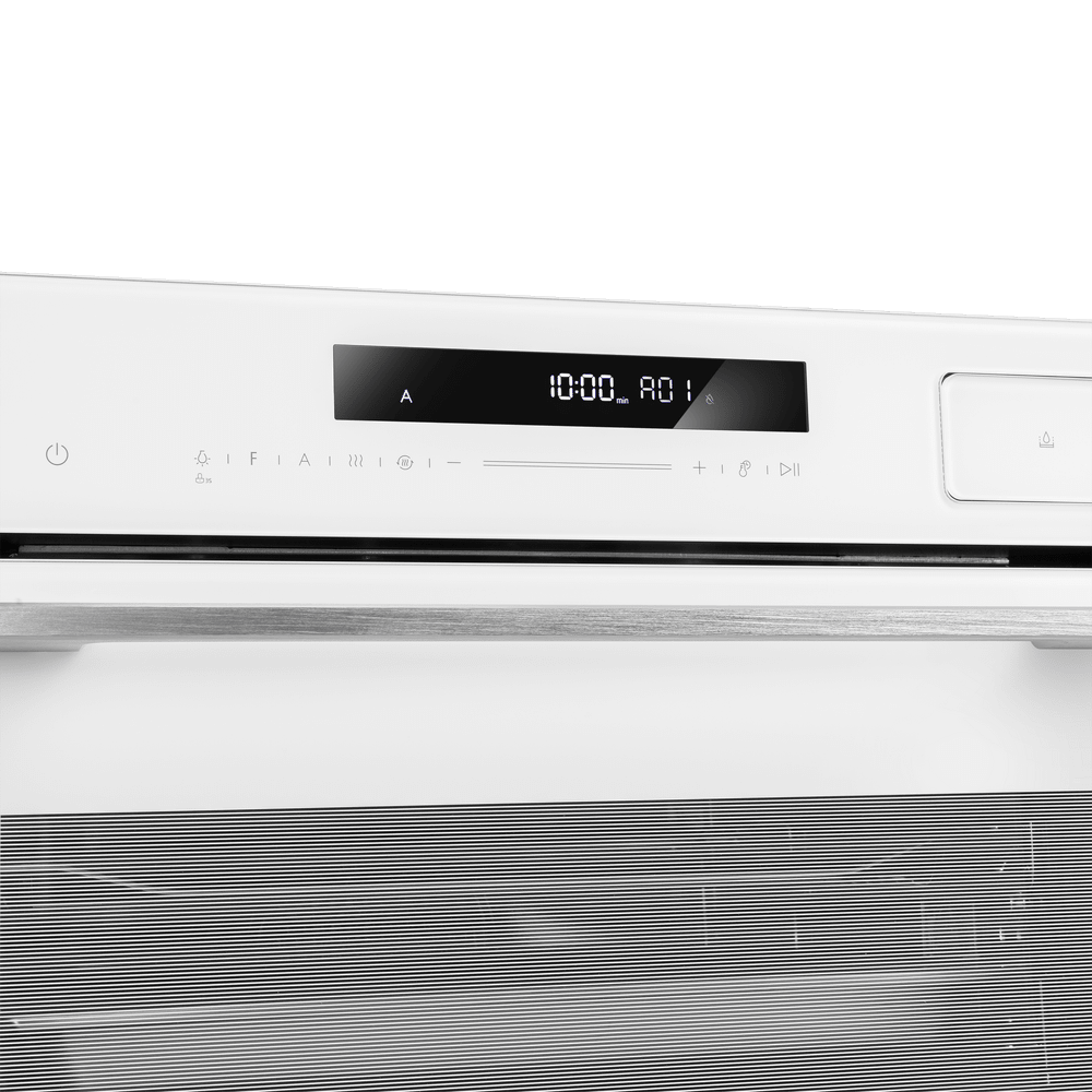 Особенности дизайна и внешней панели управления — также важный пункт при выборе духовки на кухню. В данной модели нужно обратить внимание на цвет — белый,
