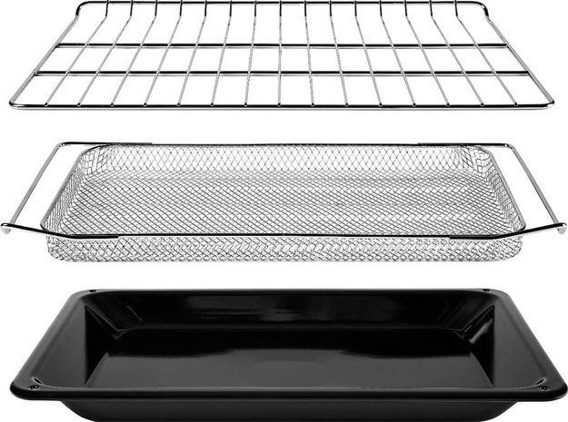 В стандартную комплектацию любого духового шкафа входят один или два противня — эмалированных или с антипригарным покрытием — и решетка. Единственный противень, как правило, имеет низкие бортики и предназначается для приготовления выпечки. Если духовка комплектуется двумя противнями, то второй отличается более высокими бортиками — его можно использовать для запекания мяса, птицы, овощных блюд. На решетке в духовке, не оснащенной грилем, обычно устанавливаются формы для запекания — стальные, керамические или стеклянные. В духовках премиум-класса количество противней может быть увеличено: к стандартному комплекту добавляются противни с перфорацией для мяса, специальные поддоны для сбора выделившегося сока.