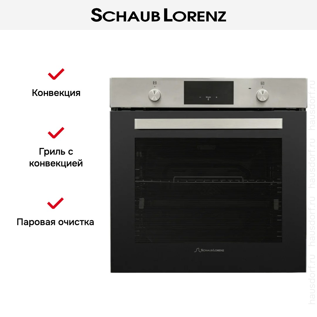 Духовой шкаф Schaub Lorenz SLB-EE6933 — независимая электрическая встраиваемая модель, созданная для тех, кто ценит сочетание эргономичного дизайна и практичности. Устройство имеет аккуратные габариты 59.5×59.5×57.5 см и подходит для ниши 60×56—58×55.5 см, что упрощает интеграцию в готовую кухонную мебель. Фасад с обработкой против отпечатков пальцев сохраняет привлекательный вид без лишних усилий. Дверца с двумя стеклами оснащена доводчиком, поэтому открывается плавно и безопасно.