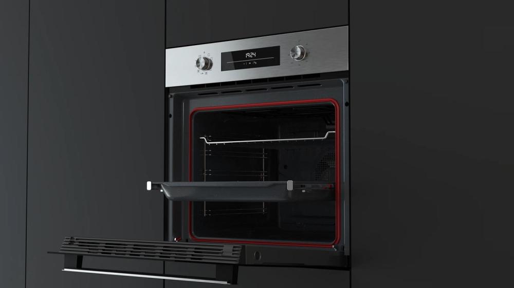Особенности дизайна и внешней панели управления — также важный пункт при выборе духовки на кухню. В данной модели нужно обратить внимание на цвет — нержавеющая сталь, специальное покрытие, предотвращающее появление заметных отпечатков пальцев,
