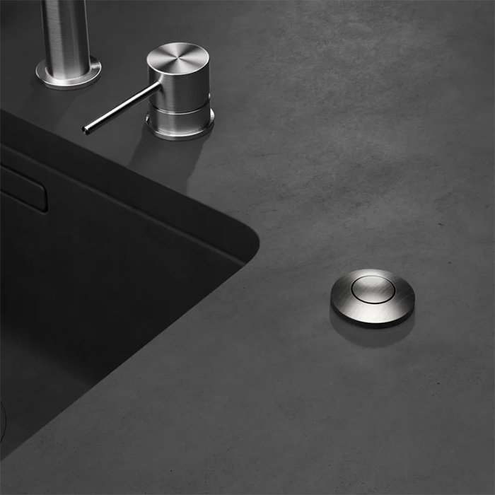 Пневматическая кнопка для измельчителя пищевых отходов позволяет включать прибор посредством давления воздуха, исключая возможность поражения электрическим током при попадании воды. Изготавливается из нержавеющей стали и пластика и располагается на бортике раковины или на столешнице.
